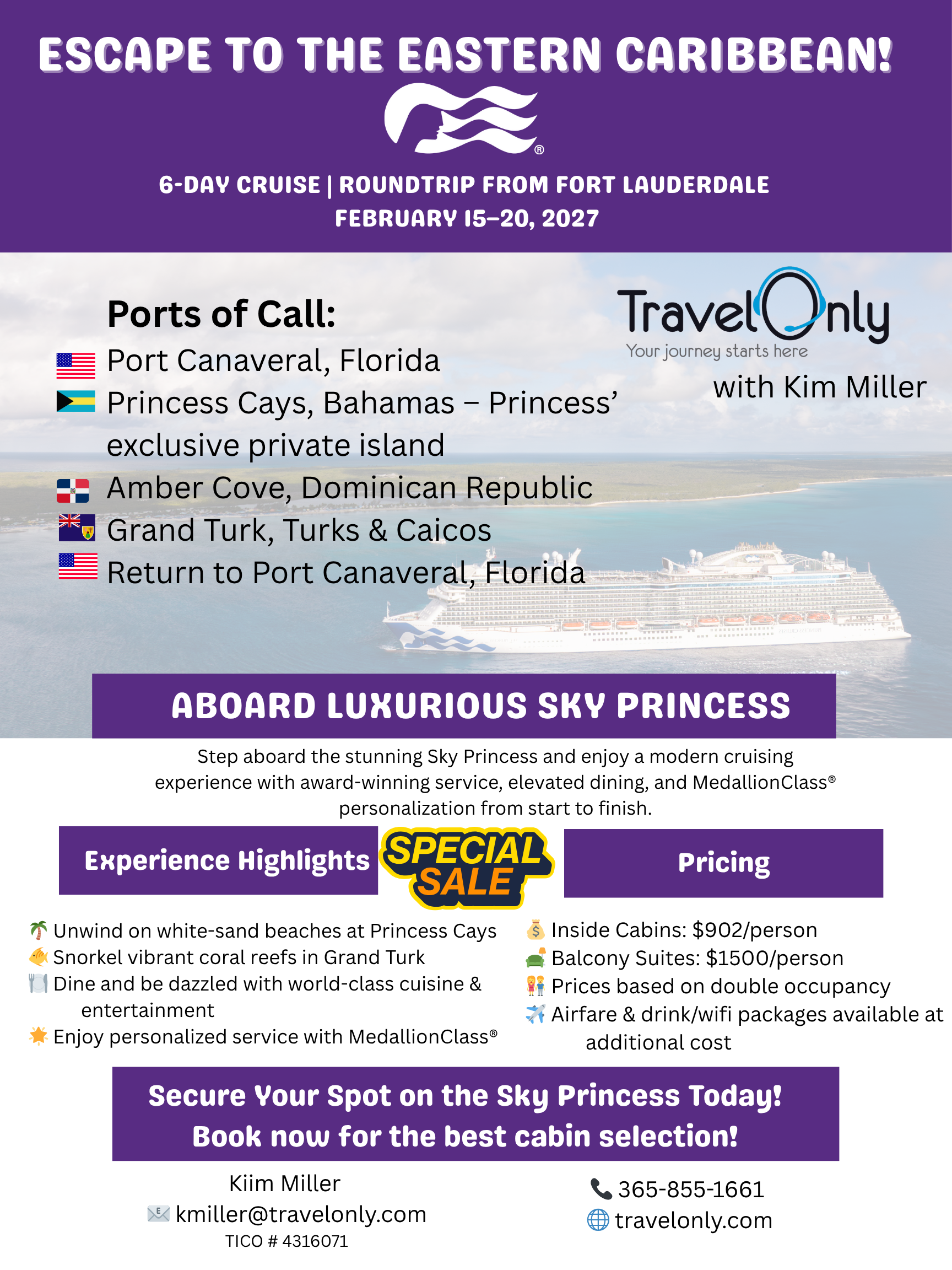 6-Day Roundtrip Cruise from Fort Lauderdale aboard the Luxurious Sky Princess Februrary 15-20, 2027