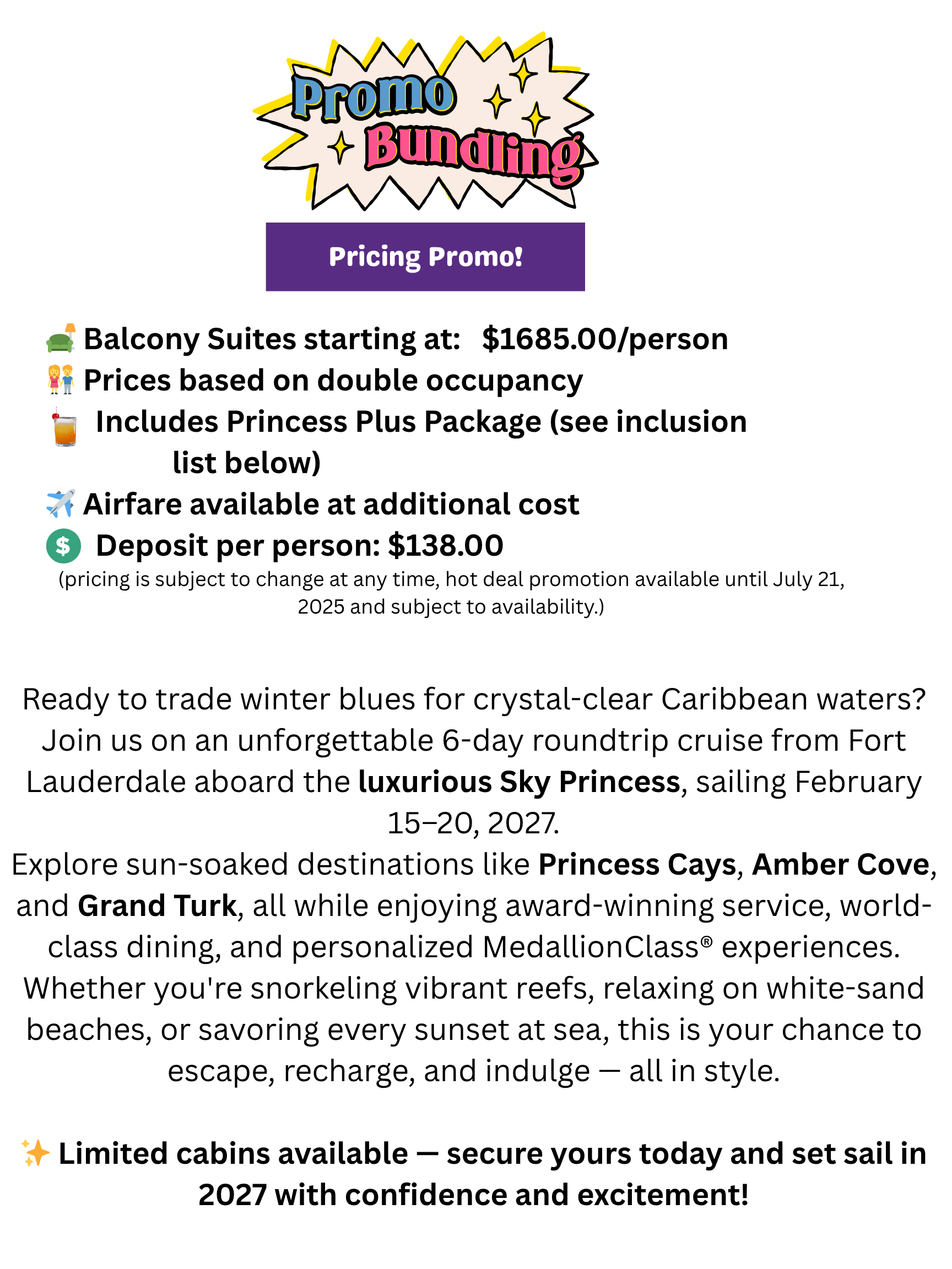 - $238.00 deposit per person, final payment due November 10, 2026 **see promo deposit pricing for Balcony Category